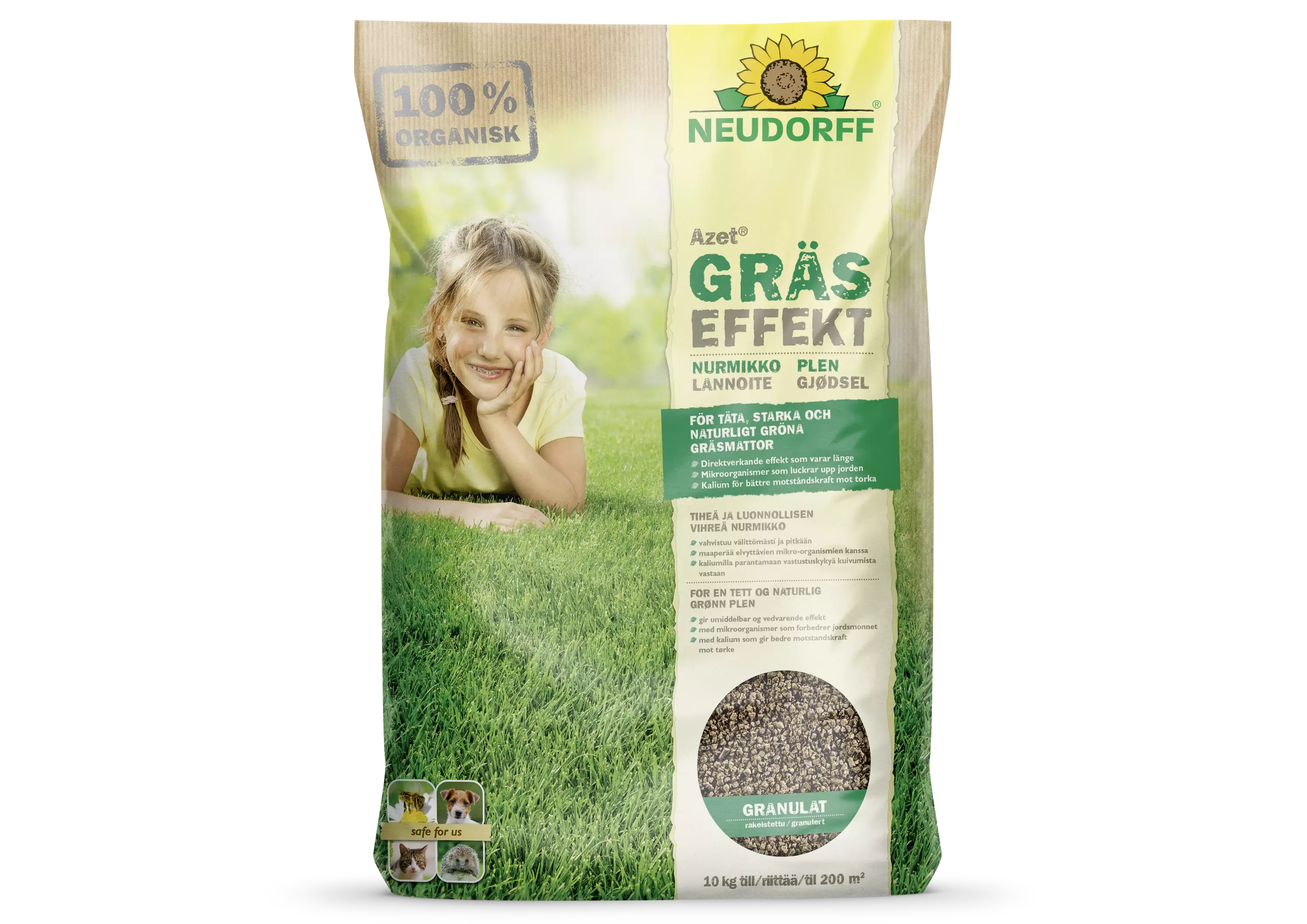 Azet Nurmikkolannoite sisältää mikro-organismeja joiden ansiosta ravinteet muuttuvat nurmikolle sopivaan muotoon. Parantaa myös maan pieneliöiden elinolosuhteita.Lannoitteen sisältämät pieneliöt muuttavat leikkuu- ja sammaljätteen luonnolliseksi ravinteeksi.Nurmikko saa jatkuvasti hitaasti ravinteita jonka ansiosta nurmikko kasvaa tuuheaksi samalla kun sen pituuskasvu vähenee.Azet Nurmikkolannoite vaikuttaa heti levityksen jälkeen.Nurmikosta kasvaa tuuhea kuin karhun turkki!