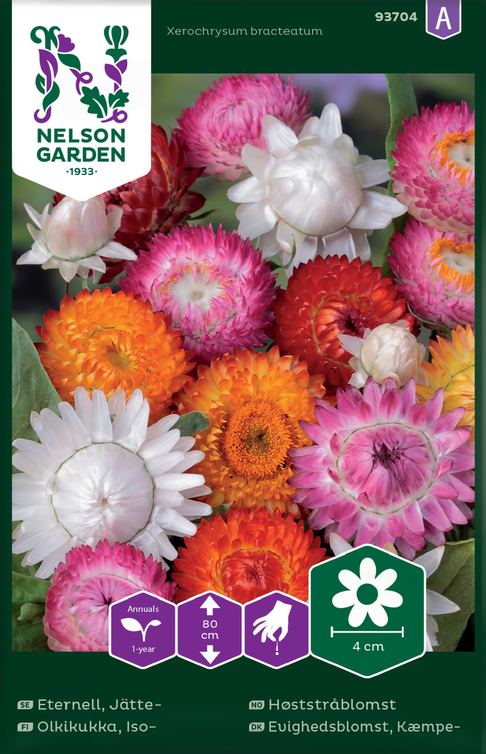 Värikäs kesäkukkasekoitus, jossa kullan, punaisen, roosan ja valkoisen sävyjä. Sopii kukkapenkkiin, leikkokukaksi ja kuivaukseen. Taimet kasvavat korkeiksi ja tekevät monta kerrottua kukkaa. Poistamalla ensimmäiset kukkanuput taimi haaroittuu, kasvaa pensasmaisemmaksi.