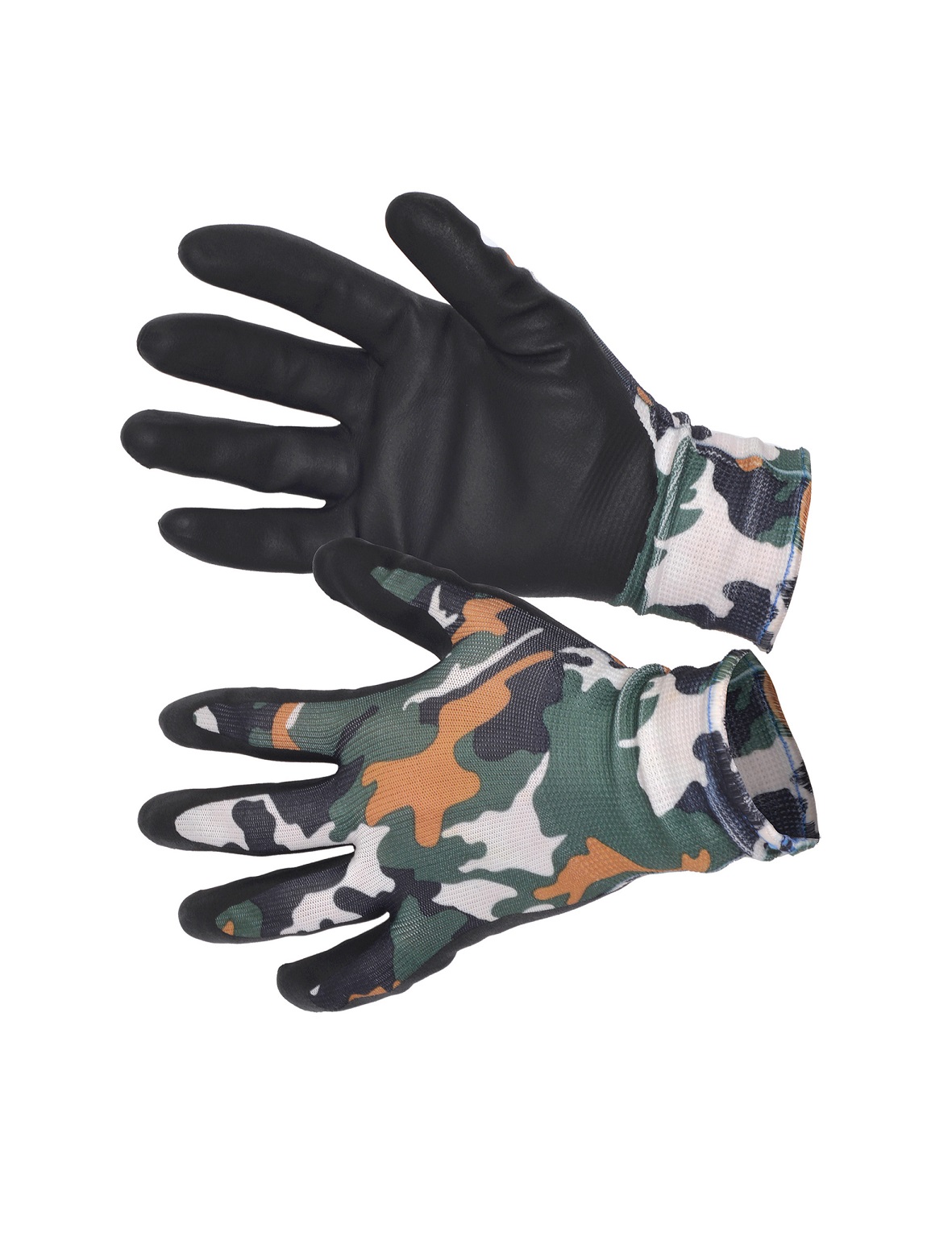 Tiheään kudottu neulos kierrätetystä polyesteristä (vesipulloista) ja spandexista, kämmenosa ja sormenpäät kastettu nitriiliin. Taipuisa käsine, jolla saa hyvän otteen.