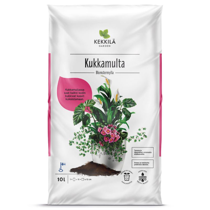 Kekkilä kukkamulta on Tumma ja ravinteikas yleismulta, joka sopii kaikille kodin viherkasveille ja kukkiville kasveille. Kukkamulta valmistetaan parhaista raaka-aineista, joilla taataan ihanteelliset ravinnesuhteet sekä ilmava ja rakenteensa hyvin pitävä koostumus. Kodin ruukkukukkien ja viherkasvien istuttaminen ja mullanvaihto on entistäkin siistimpää, sillä kasteluvesi imeytyy heti koko multakerrokseen.