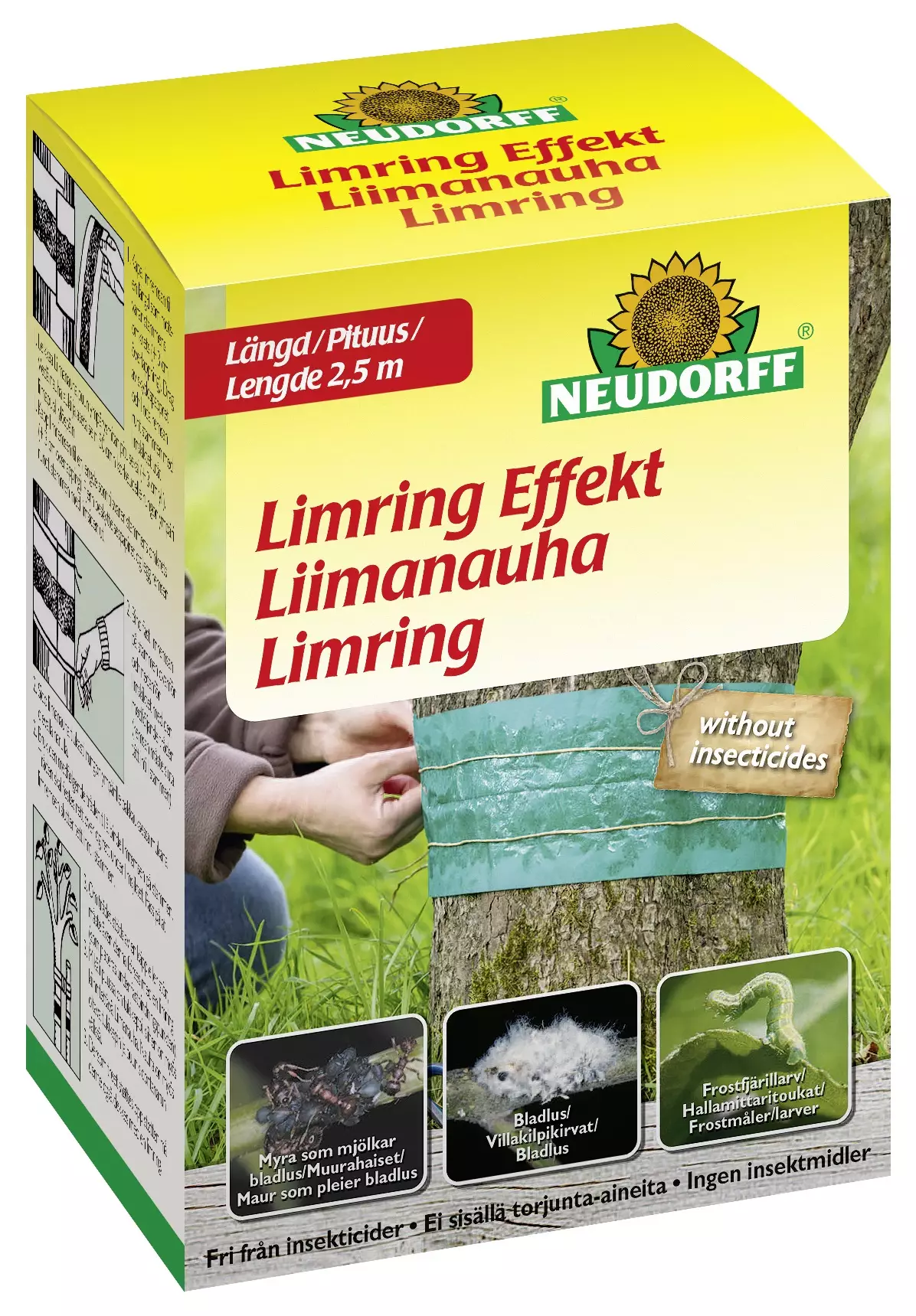 Neudorff Liimanauha suojaa hedelmä- ja koristepuita kaikilta runkoa pitkin kiipeileviltä tuholaisilta.Liimanauhalla estetään esim.hallamittarin toukkien aiheuttamia matoisia omenoita sekä muurahaisten ja kirvojen aiheuttamat lehtivioitukset.Erikoisliima ei huuhtoudu pois eikä valu korkeissakaan lämpötiloissa.