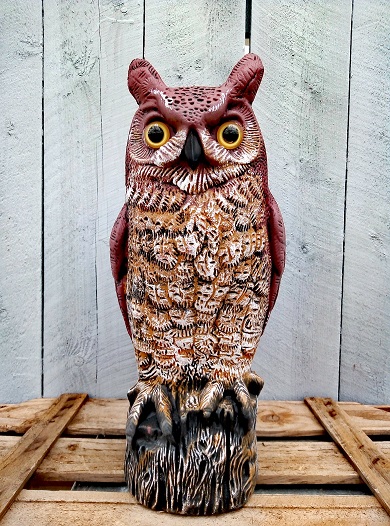 Muovinen pöllö, joka toimii sekä puutarhan koristeena että linnunkarkottimena.Pöllö seisoo omalla jalustallaan, mutta sisältää myös ripustuslenkin. Painoa saa täyttämällä pöllön esimerkiksi vedellä.