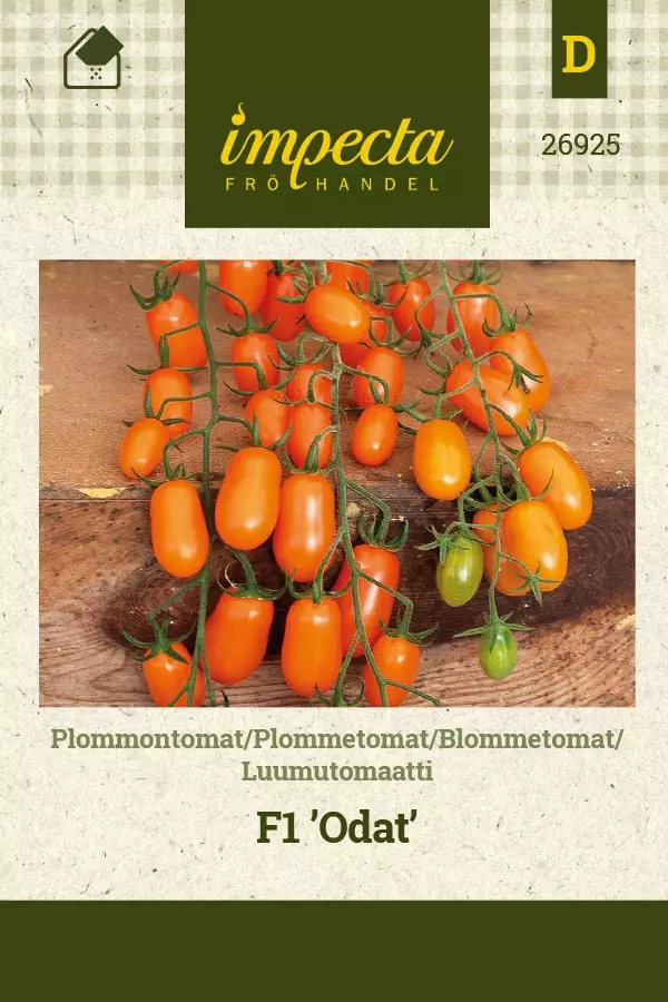 Aikainen ja runsassatoinen luumutomaatti.Pehmeänmakeat,pienet oranssit tomaatit kasvavat pitkissä tertuissa.Kestävä lajike joka sopii kasvihuoneeseen tai lämpimään, suojaisaan ulkokasvatukseen.Vaatii tuennan.Sivuversot poistetaan.