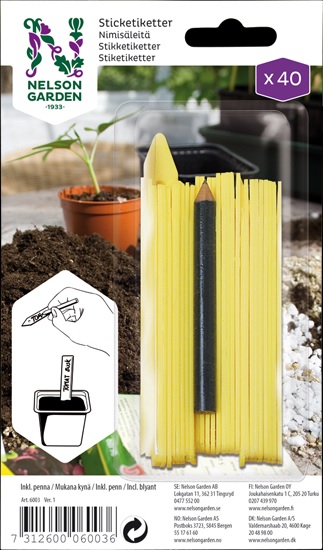 Keltaisia muovikylttejä kylvöksien ja pikkutaimien merkkaukseen. Pituus 10 cm, pakkaus sisältää kynän. Myyntierä: 40 kylttiä ja 1 kynä.