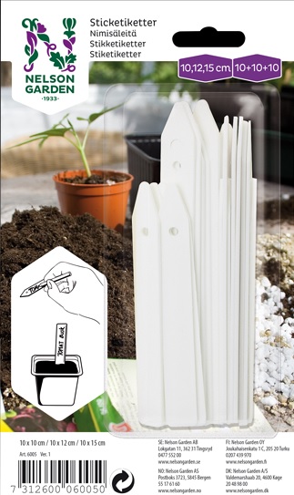 Valkoisia muovisia, eri kokoisia nimikylttejä yht.30 kpl kylvöksien ja pikkutaimien merkkaukseen. Pakkaus sisältää: 10 kpl / 10 cm pit. 10 kpl/ 12 cm pit. 10 kpl / 15 cm pit.... Lue lisää