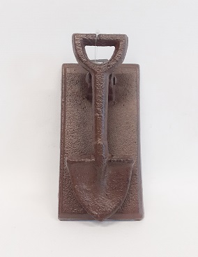 Rustiikkinen ovikolkutin tarhurin oven pieleen. Ruskeaksi maalattua metallia. Korkeus 15 cm, leveys 7,5 cm.