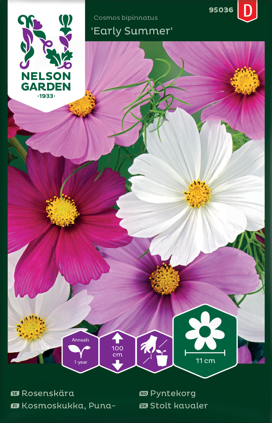 Kaunis ja helppohoitoinen kesäkukka sekoituksessa, joka sisältää valkoisen sekä vaalean ja tumman roosan sävyjä. Hauska yhteisistutuksissa ja pienikasvuisempien kukkien taustana. Tillimäiset lehdet ovat koriste sinänsä ja niiden yllä liehuvat suuret kukat antavat oman säväyksensä. Hieno kukkapenkissä ja leikkokukkana, kestää kauan maljakossa. Lannoita niukasti, muuten saat enemmän lehtiä kuin kukkia. Viihtyy kuohkeassa maassa, johon on sekoitettu kompostia.