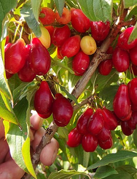 Punamarjakanukka on pieni puumainen pensas. Keltaiset kukat toukokuun alussa, punainen oliivinmuotoinen luumarja. Marjat syötäviä ja sisältävät runsaasti C-vitamiinia, maku on kuin sekoitus karpaloa ja hapankirsikkaa. Sadonkorjuu tapahtuu ravistamalla oksia. Hedelmä on täysin kypsä vasta kun se on saanut tumman rubiininpunaisen värin ja putoaa pensaasta. Syysväri punertava.