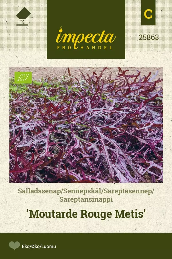 Salaattisinappi jonka punaisissa liuskottuneissa lehdissä sekä vihreissä varsissa on keskivoimakas sinapin maku.Koristeelliset lehdet tuovat salaattisekoituksiin lisää makua ja luonnetta.Nopeakasvuinen ja kylmänkestävä.Voidaan kylvää erissä hyvän sadon varmistamiseksi koko kesän. Tuottaa satoa läpi kauden. Satoa voidaan korjata pitkälle myöhäissyksyyn.