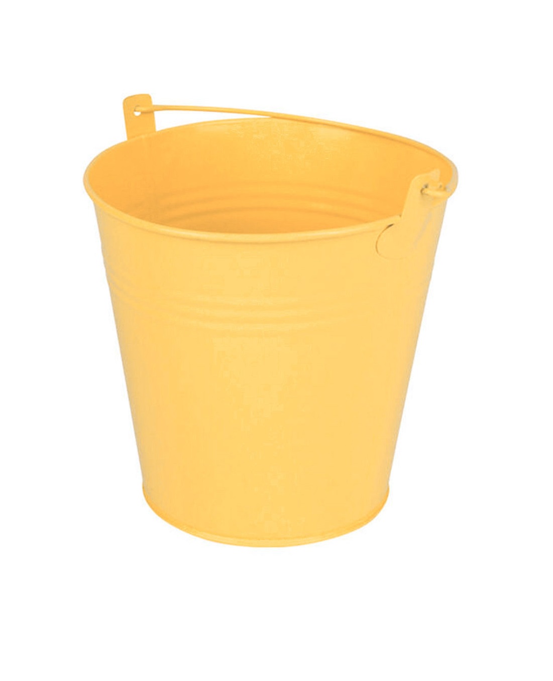 Pirteä keltainen sinkkiämpäri. Ruukun mitat: halkaisija 13 cm, korkeus 11cm