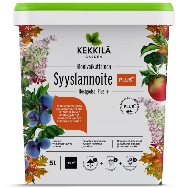 Kekkilä Syyslannoite Plus+ on puutarhan monivaikutteinen erikoislannoite. Se edistää seuraavan vuoden kukintaa ja satoa ja auttaa kasveja valmistautumaan talven tuloon ja talvehtimaan vaativissa talviolosuhteissa. Lannoitteen sisältämä fosfori vahvistaa juuristoa, runsas kalium vahvistaa satoa ja kukintaa. Pieni määrä typpeä edesauttaa kaikkien ravinteiden vaikutusta.Syyslannoittaminen on tarpeen kukkiville ja satoa tuottaville kasveille.