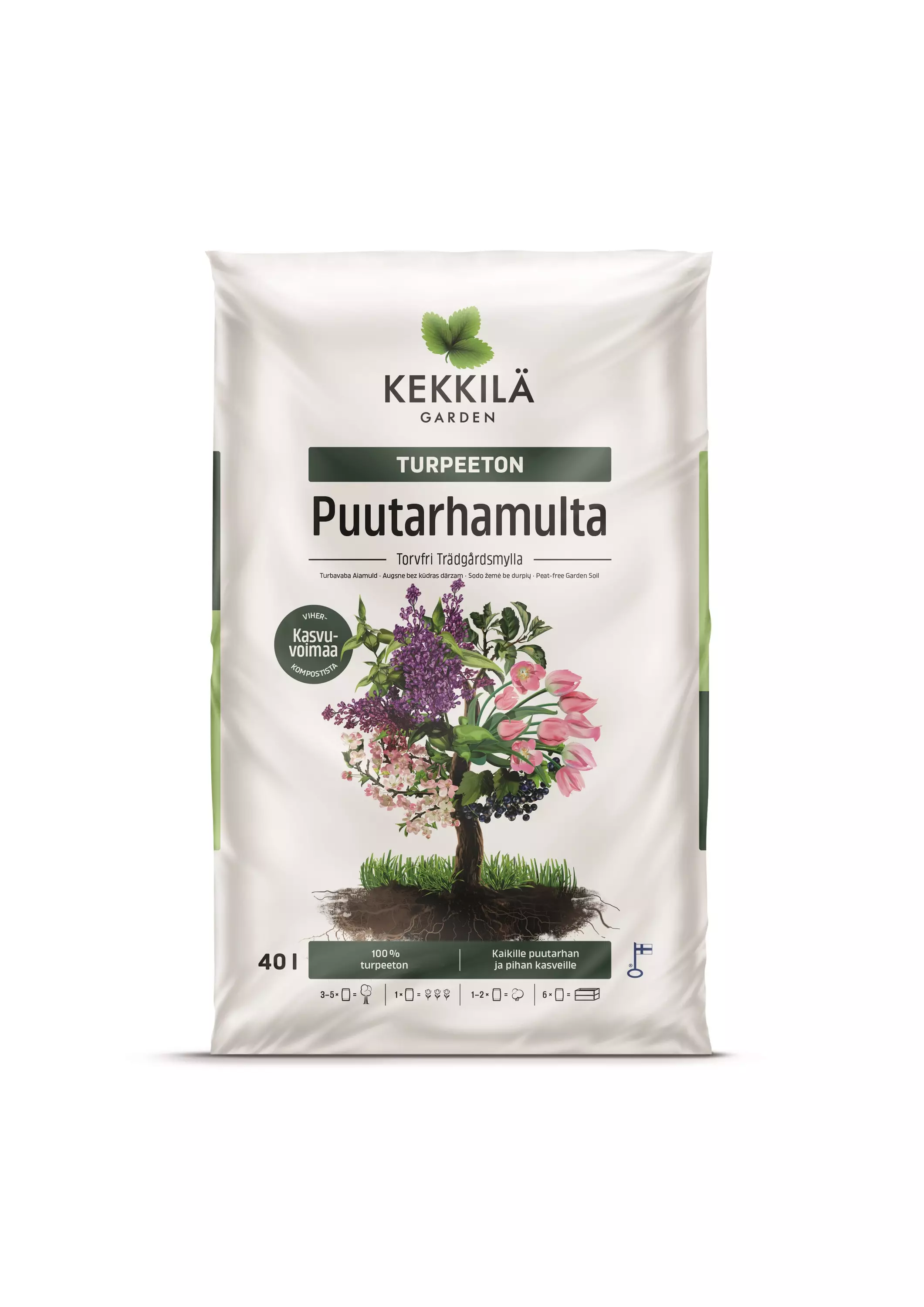 Uusiutuvista ja kierrätetyistä raaka-aineista valmistettu turpeeton puutarhamulta.Käyttövalmis multa sopii kaikille puutarhan kasveille sekä viljelylaatikoihin ja kesäkukille.